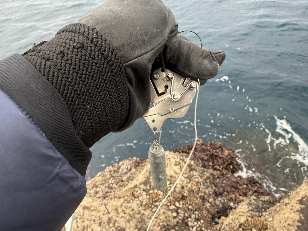 ラインカッターにつけるオモリは50号ぐらいを使用します。最低でも40号ぐらいないとなかなか海中に入っていかずちょっと扱いづらいです。