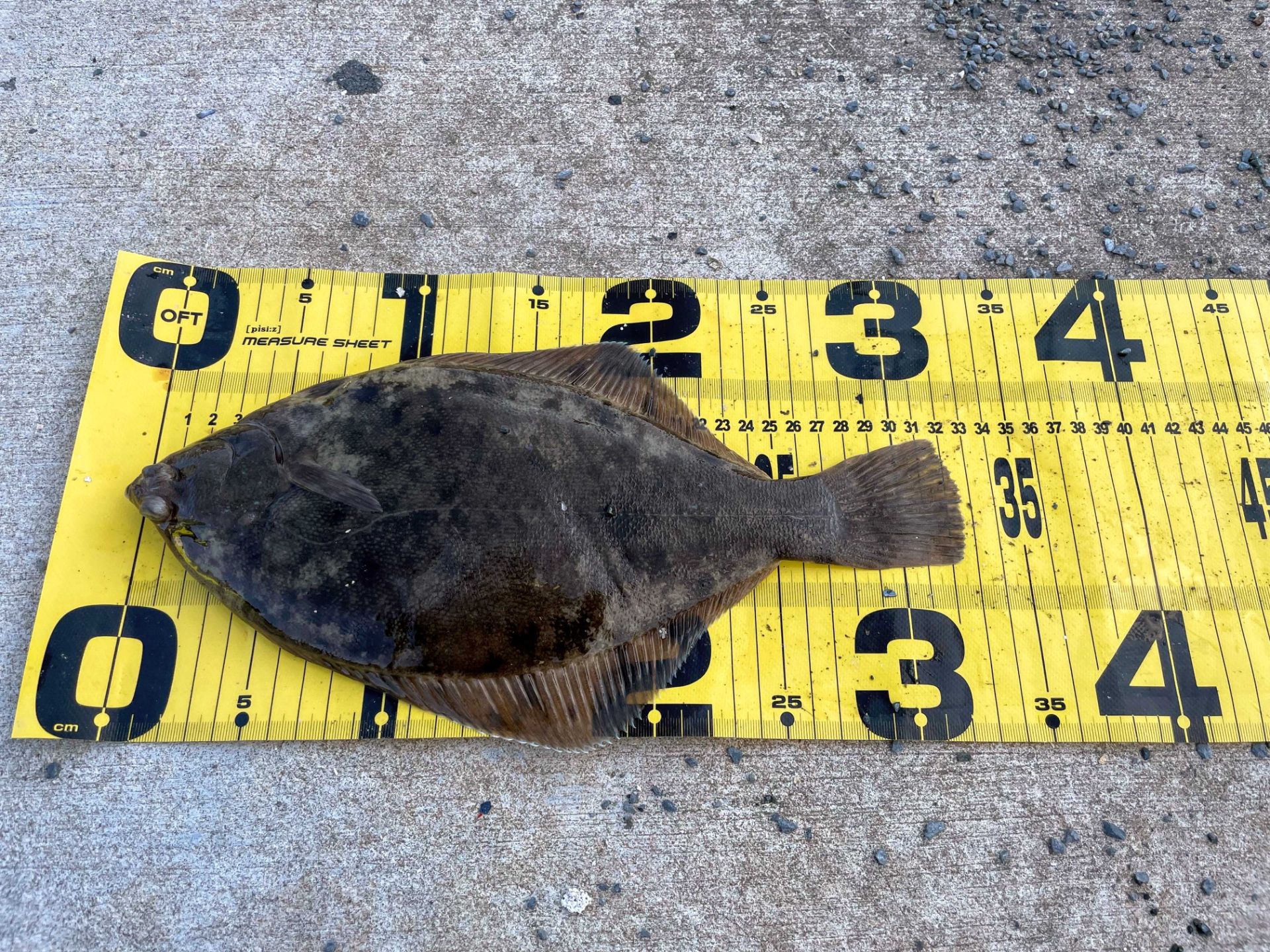 30cm ちょっとのマコガレイ。秋と春マコガレイがよく釣れます。特に秋のマコガレイは肉厚で美味しいです。卵巣を好んで食べる人もいます!春は産卵後でお腹まわりの張りがなくなりますが、荒食いの時期なのでよく釣れます。