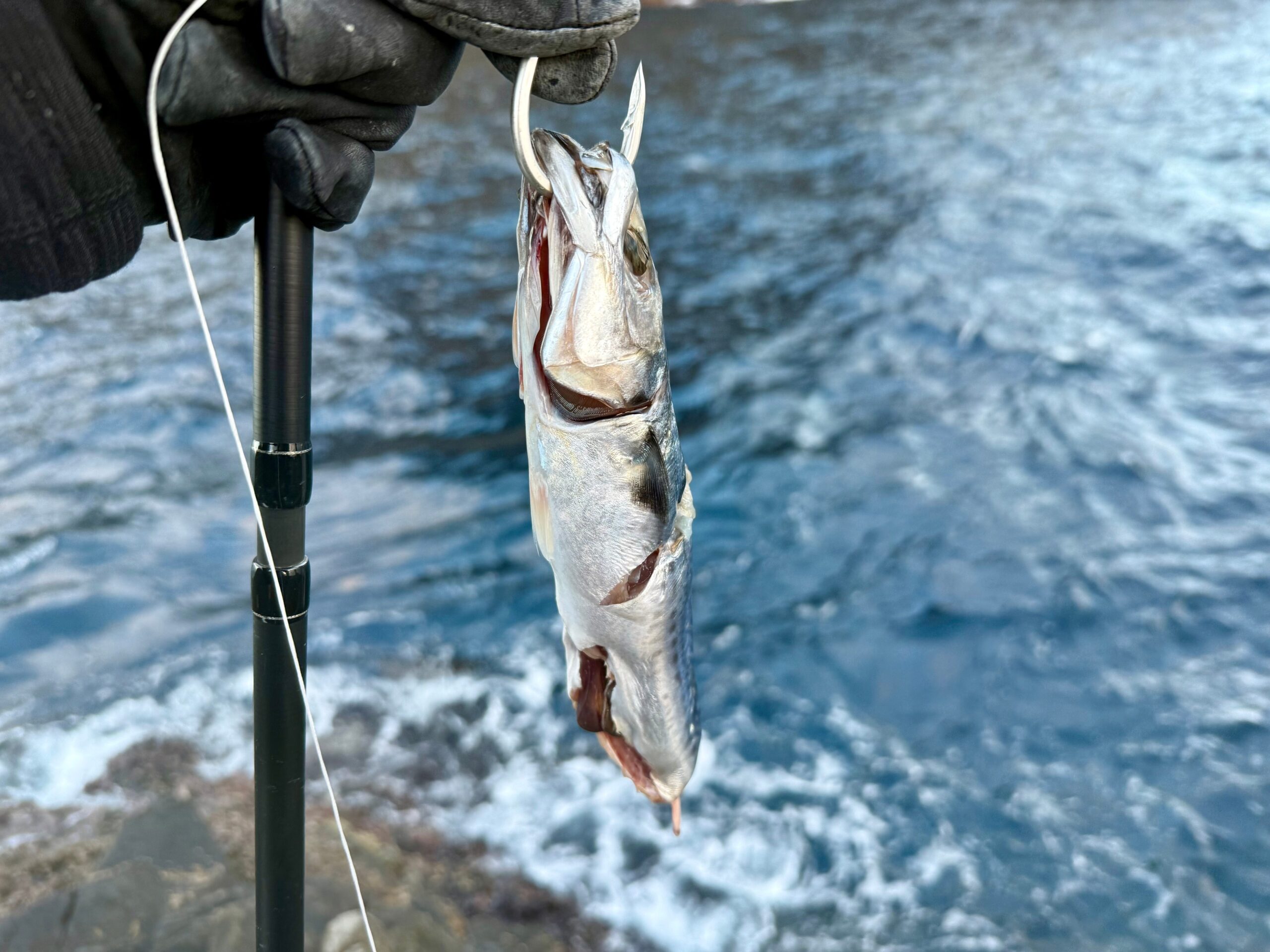 サバを流していると急にラインの放出が止まらなくなります。それが魚がきた合図なんですが、ここで即合わせするとバレます。餌の先端をかじって走っているだけというパターンも多いので、しっかり送り込み、ラインの放出スピードが加速したら合わせのチャンスです。結構送り込んだつもりでも飲み込むことは稀で、大概カンヌキにしっかりかかっています。